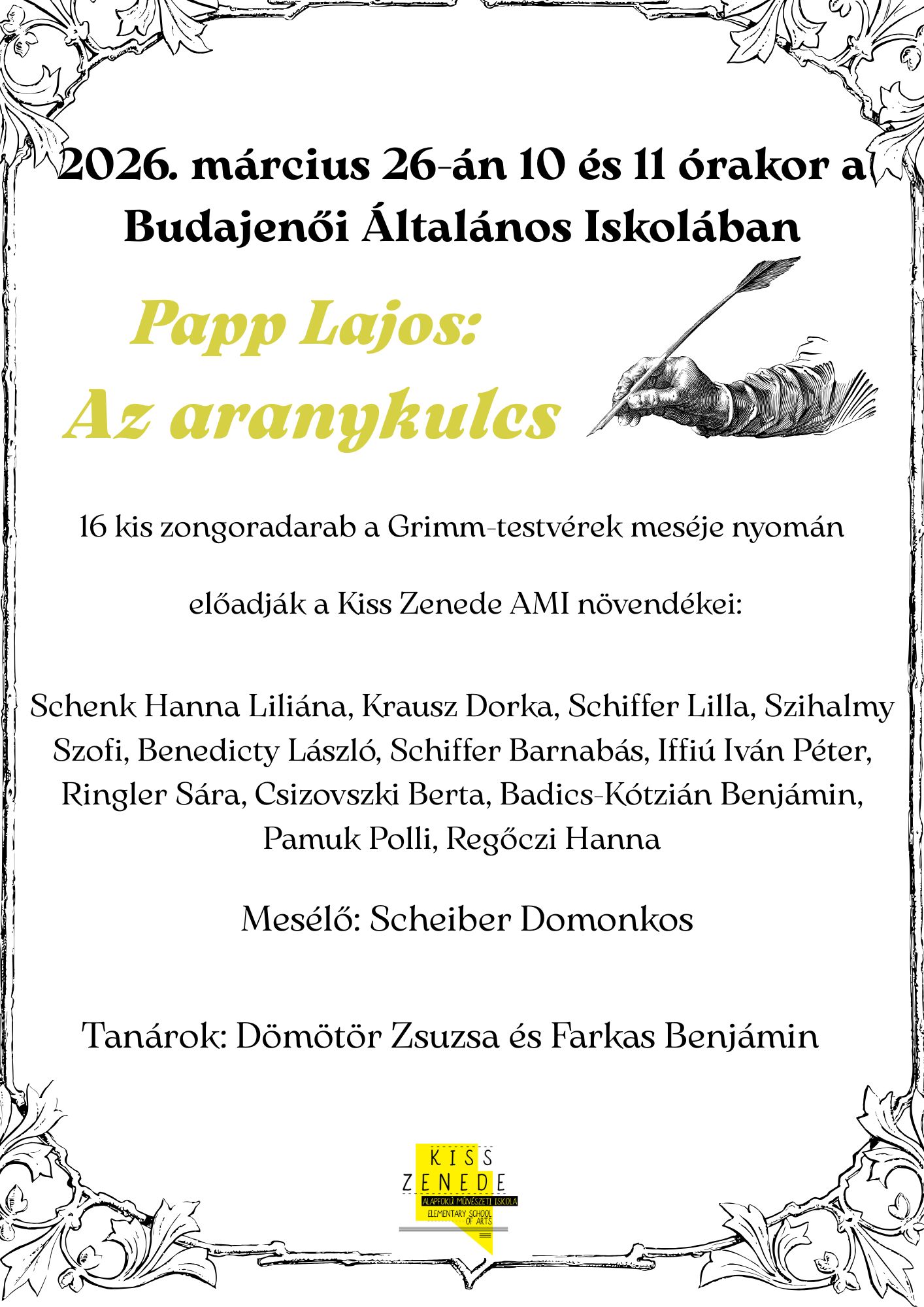 2026. március 26-án délelőtt iskolánk 1. és 2. osztályos tanulói számára a Zenede zongora tagozatos növendékei kis koncertet adnak.